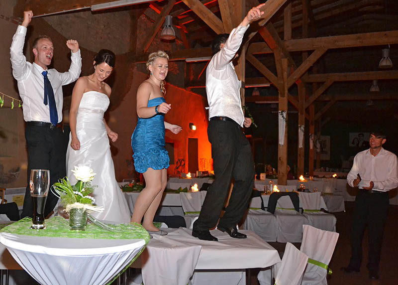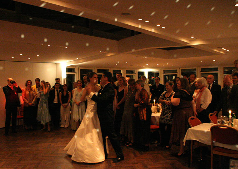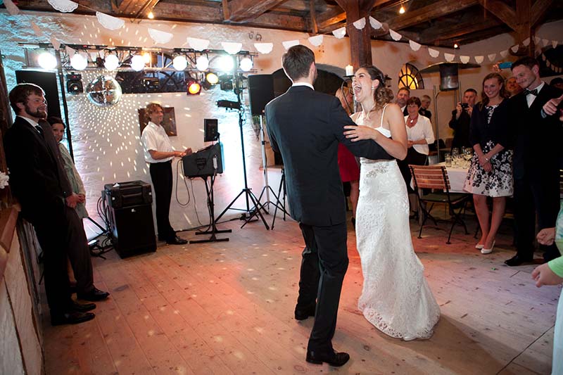 Nach dem Essen drängen die Gäste das Brautpaar, nun endlich die eigentliche Hochzeitsparty mit dem Eröffnungstanz zu starten! Möglichst alle Anwesenden kommen auf die Tanzfläche und bilden einen großen Kreis. Oft wollen die Beiden dieses Highlight nicht komplett allein unter den kritischen Blicken von Freunden und Verwandten bestreiten und bitten nach wenigen Umdrehungen die anderen mit auf's Parkett. Manche Paare bereiten sich aber intensiv vor und möchten ihren Song ganz allein zu Ende tanzen.