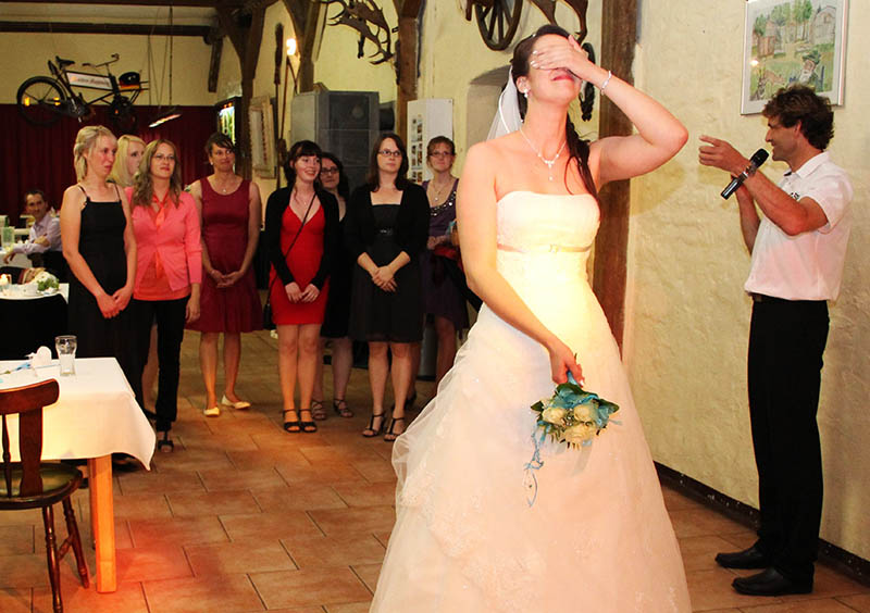 Höhepunkte, wie z.B. das Anschneiden der Hochzeitstorte, werden selbstverständlich anmoderiert, um das Interesse der Gäste auf das Ereignis zu wenden. Für Ansprachen, z.B. vom Brautvater, steht ein Profi-Funkmikrofon (Sennheiser) zur Verfügung.