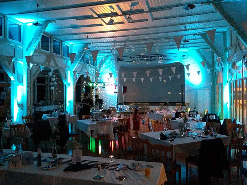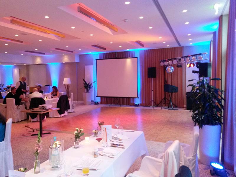 Um sicher zu stellen, dass beim Eintreffen der ersten Gäste das Arrangement von Licht- und Tontechnik steht, plane ich genügend Zeit (ca. 1,5h) für den Aufbau der Technik ein. Sie fügt sich optisch und funktionell in das Gesamtkonzept von Bestuhlung, Tanzfläche, Geschenketisch, Hochzeitstorte usw. ein. Das Equipment ist perfekt auf den Einsatz abgestimmt: Weder großvolumige, unansehlichen "Kisten" noch herumliegendes Kabelgewirr stören den visuellen Gesamteindruck.